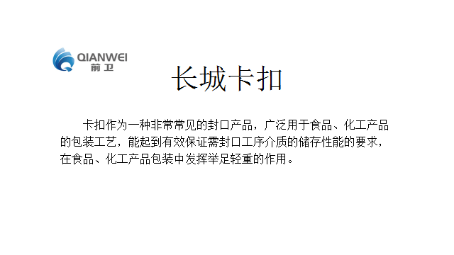 博野縣前衛(wèi)卡扣線材有限公司始創(chuàng)于1996年,是集設計、研發(fā)、生產(chǎn)、銷售、服務為一體的生產(chǎn)廠家。 公司現(xiàn)有生產(chǎn)流水線17條,主要生產(chǎn)鋁卡扣、鋁絲、長城卡扣、雙孔袋、打卡機及灌裝設備。產(chǎn)品行銷全國各地。 公司以優(yōu)異的產(chǎn)品及完善的服務在業(yè)內(nèi)享有良好的聲譽。
